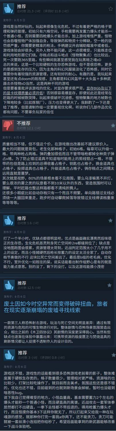 玩家普遍称赞游戏带来的沉浸式生存恐怖体验,能看到很多恐怖游戏老前辈的影子:剧情紧凑,恐怖场景氛围出色,画面表现也十分精美。不过,对于游戏中严格的资源管理,玩家意见不一——部分玩家认为这增加了游戏的挑战性,而另一些玩家则觉得资源过于稀缺,门槛略高。