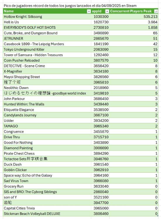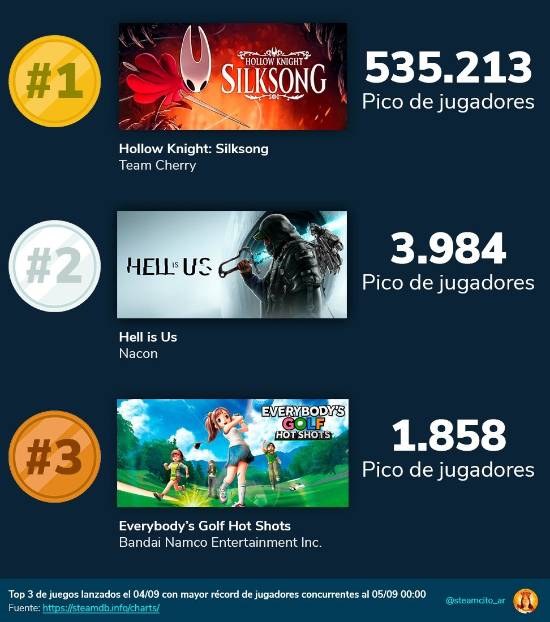 日前,推主@steamcito_ar汇总了一份清单,盘点了与《空洞骑士:丝之歌》同日发售的游戏,在9月4日发售的所有游戏中,(9月5日当天)《空洞骑士:丝之歌》吸引了98.3%的玩家,《地狱即我们》仅吸引了0.6%的玩家,超八成游戏的玩家在线峰值不足10人,一起来看下。