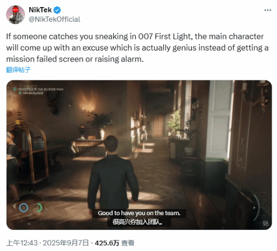 除了全新实机预告以外,《007:黎明曙光》还公开了一段长达30分钟的实机演示,深度聚焦于詹姆斯·邦德在MI6的第一项任务。日前,推主@NikTekOfficial发文提到了实机演示的一处特性:在游戏里,如果有人发现主角潜行,主角会想出一个堪称天才的借口,而不会导致任务失败或触发警报。