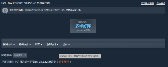 类银河战士恶魔城游戏《空洞骑士:丝之歌》已经发售数日,游戏因翻译、难度等原因被很多玩家吐槽,其在Steam平台的好评率也在不断降低。截至发稿前,《空洞骑士:丝之歌》在Steam平台简体中文区的评价已经跌至“多半差评”,好评率降至39%。