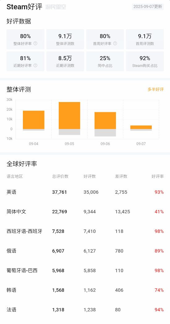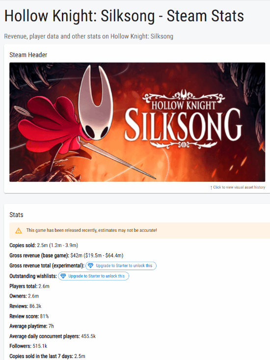 需要注意的是,Gamalytic为第三方统计网站,其数据不能够保证100%准确,因此仅供参考,详细销量信息应以《空洞骑士:丝之歌》官方公布的为准,还望各位玩家理性看待。