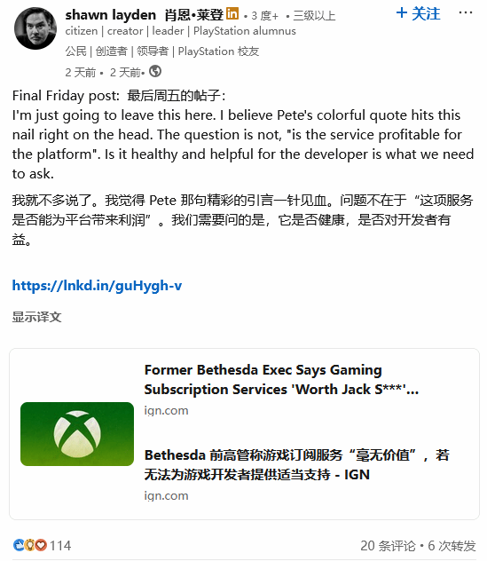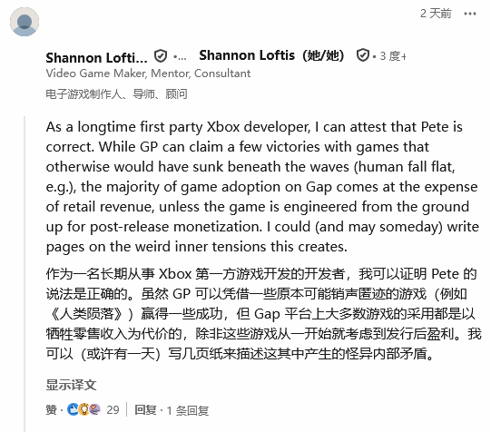 曾担任微软第一方工作室World' s Edge负责人、Xbox游戏工作室副总裁的Shannon Loftis也加入了相关讨论。她回复Shawn Layden的博文并表示赞同Pete的言论: