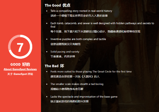 《巨人教团》是《夺宝奇兵:古老之圈》的一个DLC,已于2024年12月9日和游戏本体一同正式发售。外媒GameSpot近日发布了该DLC的评测报告,并给出了7分的成绩。本文仅摘译总结部分如下: