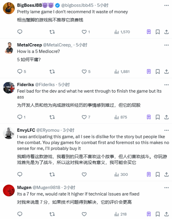 部分玩家认同IGN的观点,认为游戏除了战斗之外,其他方面都非常“平庸”。有网友直言不讳地表示:“为开发者所经历的一切感到难过,但游戏本身确实不行。”
