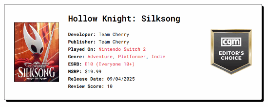 外媒cgmagonline今日发布了Nintendo Switch 2版本《空洞骑士:丝之歌》的评测,给出了10分满分的高分评价。