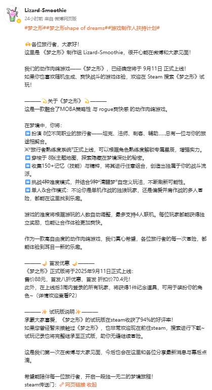 据了解,《梦之形》是一款融合了MOBA策略性与rogue爽快感的动作肉鸽游戏,试玩版在steam收获了94%的好评率!