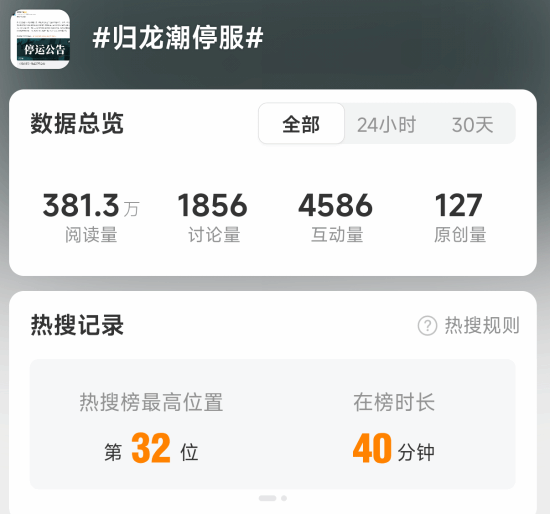 今日,《归龙潮》官方发布关服停运公告,“归龙潮停服”的话题也迅速登上微博热搜。