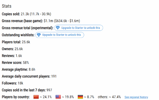 数据显示,该游戏收到了1600份评价,好评率为58%。玩家平均游戏时长为8.6小时,而平均每日同时在线玩家数约为191人。在过去7天内,游戏售出了997份。