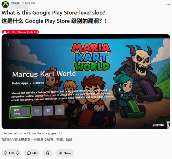 《马里奥赛车:世界》是最早一批登陆任天堂NS2的独占游戏,据任天堂的官方财报统计显示,游戏的销量已达563万份。而近日,有玩家在Xbox商店里发现了一款很明显是山寨《马里奥赛车:世界》的游戏——《马库斯赛车:世界》。