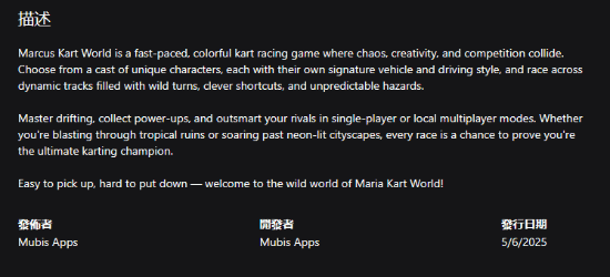 另外,游戏的简介显示其发行于2025年6月5日(书写习惯不同),而这恰好是《马里奥赛车:世界》发售的同一天。