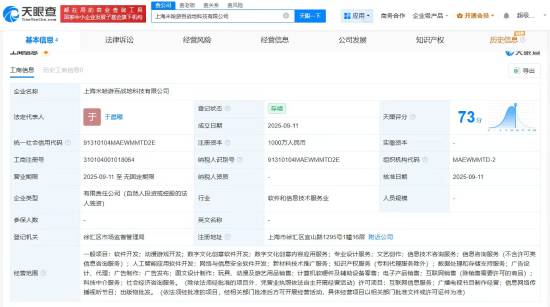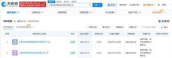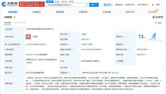 9月11日,天眼查工商信息显示,上海米哈游百战地科技有限公司、上海米哈游稻海桑田科技有限公司成立,法定代表人均为于晨曦,注册资本均为1000万人民币,经营范围包括软件开发、人工智能应用软件开发、数字文化创意软件开发等。股东信息显示,上述公司均由上海米哈游网络科技股份有限公司全资持股。