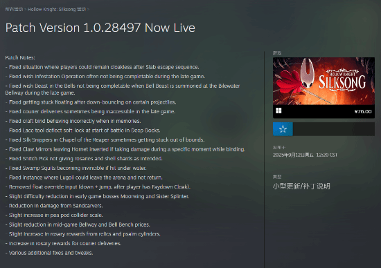 9月12日,《空洞骑士:丝之歌》在Steam平台的首个更新补丁1.0.28497现已正式上线,官方公开了补丁说明。