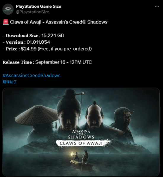 《刺客信条:影》首个DLC即将于9月16日上线,数据博主@PlayStation Game Size分享了该扩展内容在PS5平台的文件大小: