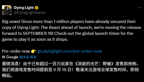 原定于2025年8月22日发售的《消逝的光芒:困兽》曾宣布跳票,推迟四周至9月19日发售。而如今,Techland再次调整了游戏的发行计划,不过这次是好消息——为了庆祝游戏全球预购量突破100万份,发售日提前一天,从9月19日改为9月18日!
