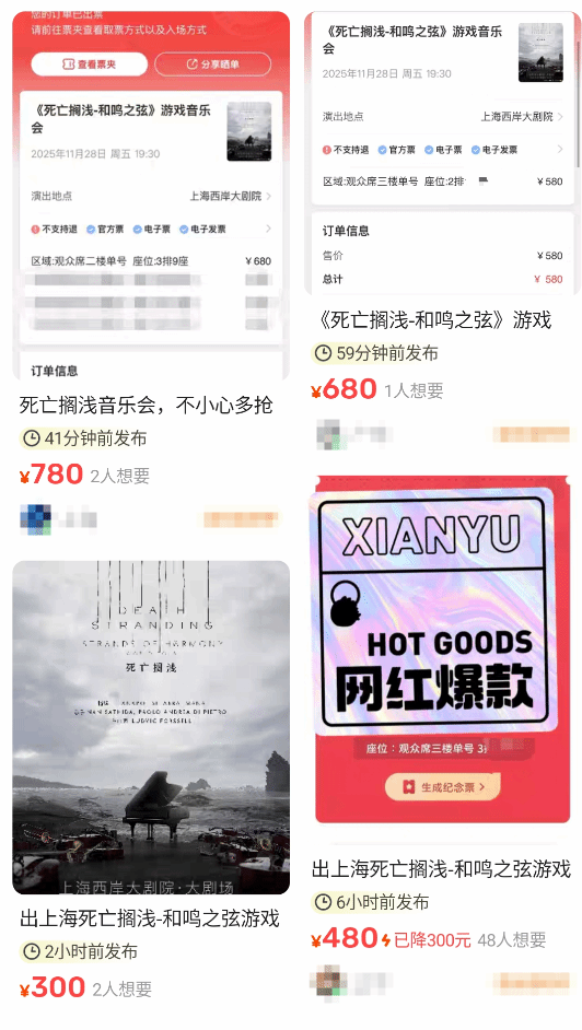 《死亡搁浅ー和鸣之弦》游戏音乐会将于11月28日19:30正式开始,门票于9月14日中午12:00正式开售,但在开售不久后就售罄,一些门票则到了黄牛的手上。