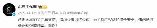 音乐会门票的官方价为280元、480元、580元、680元、780元以及1180元,截至发稿前,闲鱼里出现了不少转售门票的链接,不同价位的门票分别加至100元到300元售卖。小岛工作室表示:“感谢大家的关注与支持,追加公演即将公布,为了您的权益和资金安全,请勿通过非正规渠道购票,谢谢!”