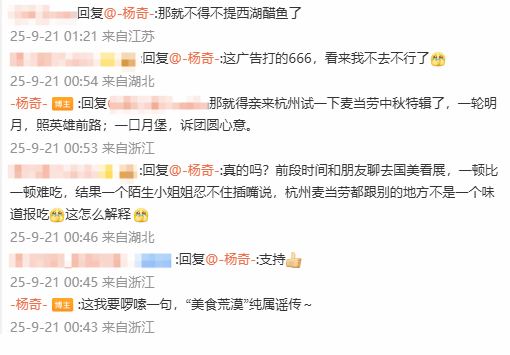 在评论区里,有玩家调侃杭州是“美食荒漠”,认为除了不好吃,哪里都好。对此,杨奇回应道:“这我要啰嗦一句,“美食荒漠’纯属谣传~”除此之外,还有玩家认为杭州的麦当劳和别的地方不是一个味道,不好吃。杨奇则表示:“那就得亲来杭州试一下麦当劳中秋特辑了,一轮明月,照英雄前路;一口月堡,诉团圆心意。”