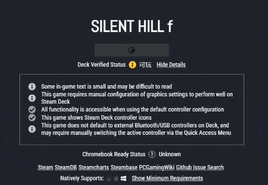 在SteamDeck的测试网站Protondb上,他们为《寂静岭F》给出了“可玩”评级,并指出虽然用SteamDeck玩有些问题,但还是可以愉快游玩的。