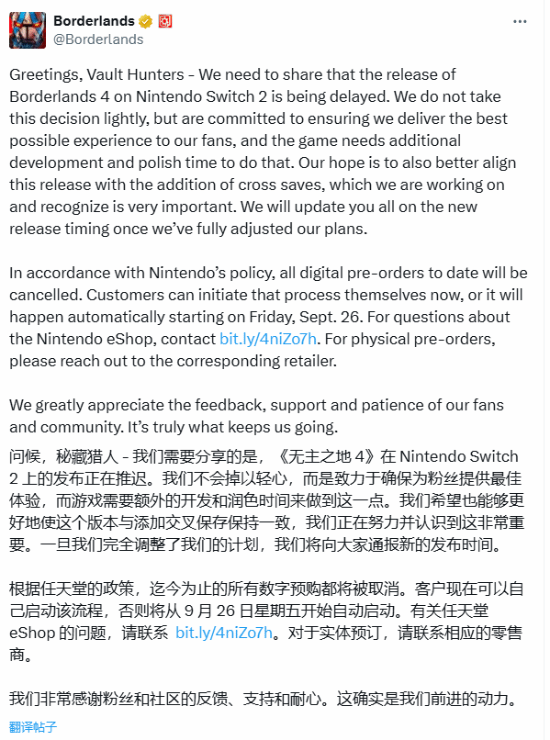 原定于10月3日发售的《无主之地4》Nintendo Switch 2版宣布延期,Gearbox Entertainment在最新声明中表示,延期是为了确保为玩家提供“最佳的游戏体验”。开发团队需要更多的时间来进一步打磨游戏并解决现有的技术问题。
