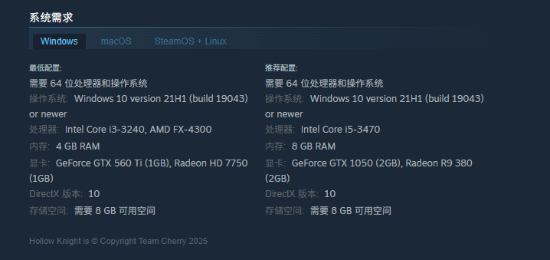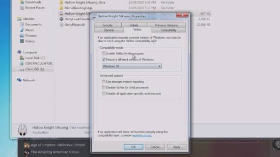 尽管Valve已停止在Steam中对Windows 7系统的支持,但一名玩家成功在Windows 7操作系统上运行了《空洞骑士:丝之歌》,只不过这一实验过程需要多个非官方补丁与变通方法。