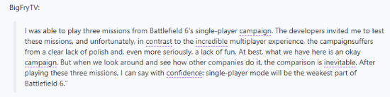 而外媒bigfryTV则表示:“我有幸体验了《战地6》单人战役中的三个任务。开发者邀请我测试这些关卡,遗憾的是,与惊艳的多人模式形成鲜明对比,单人战役明显缺乏打磨,更严重的是缺乏趣味性。充其量,这只能算是一部中规中矩的战役。但环顾业界其他公司的作品,比较在所难免。通关这三个任务后,我可以断言:单人模式将成为《战地6》最薄弱的环节。”