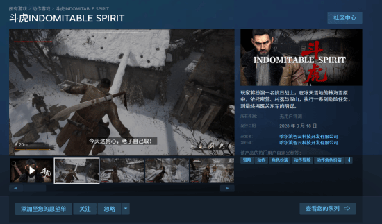 由哈尔滨智云科技开发有限公司开发的抗日题材动作游戏《斗虎》目前已经上架Steam。商店页面显示本作的计划发行日期为2028年9月18日。