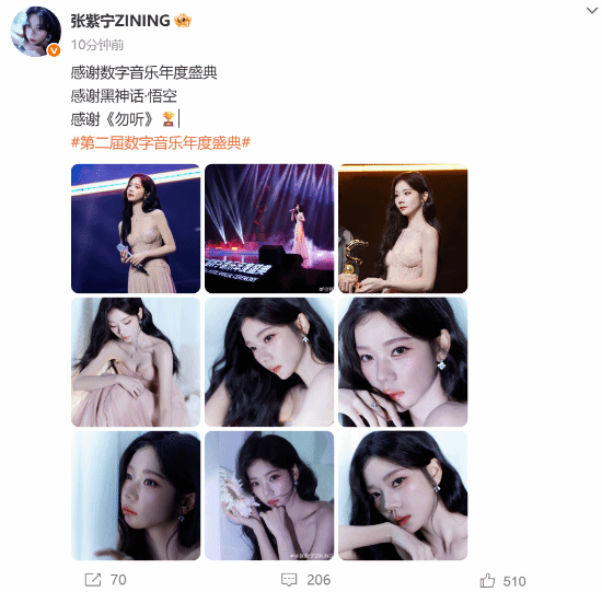 张紫宁于今日通过社交平台发文致谢,晒出多张现场美照并表示:“感谢数字音乐年度盛典 感谢黑神话・悟空 感谢《勿听》”。