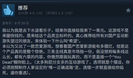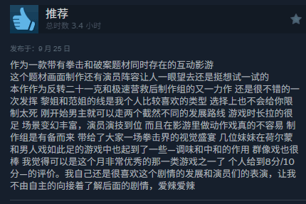 给出好评的玩家表示,本作并不是无脑跟风真人恋爱影游平庸作品,而是通过精良的制造给这个品类树立了标杆,内容非常惊艳,演员的演技也相当精彩。