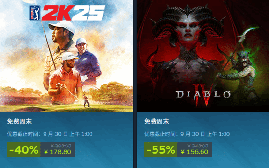 Steam平台开启免费周末试玩活动,本次提供《Rematch》、《PGA巡回赛2K25》与《暗黑破坏神4》三款游戏,截至9月30日凌晨1点。