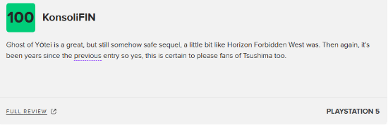 KonsoliFIN表示:《羊蹄山之魂》是很棒的续作,虽然有一些保守,但是肯定会让系列粉丝满意。