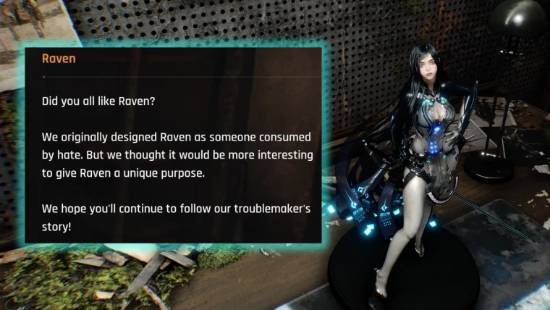在模型旁的留言中,开发者特别提到:“你们都喜欢渡鸦吗?她原本被设定为被仇恨吞噬的角色,但我们认为给她一个独特目标会更有意思。希望你们继续关注这位‘麻烦制造者’的故事!” 这一段话也被普遍解读为后续剧情或衍生内容的伏笔。