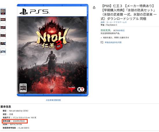 据多家外媒报道,《仁王3》的发售日期疑似在亚马逊泄露,页面显示本作将于2月6日发售。随后,商品页被下架。