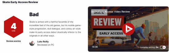 IGN今日发布了由Full Circle开发、EA发行的体育游戏《极速滑板》的评测文章,并给出4分的差评。简评提到,《极速滑板》虽复现了前作的操控手感,但其手游化的成长体系、愚蠢的对话与俗气的美术风格,使抢先测试版在其他所有维度都远不如经典的原作。