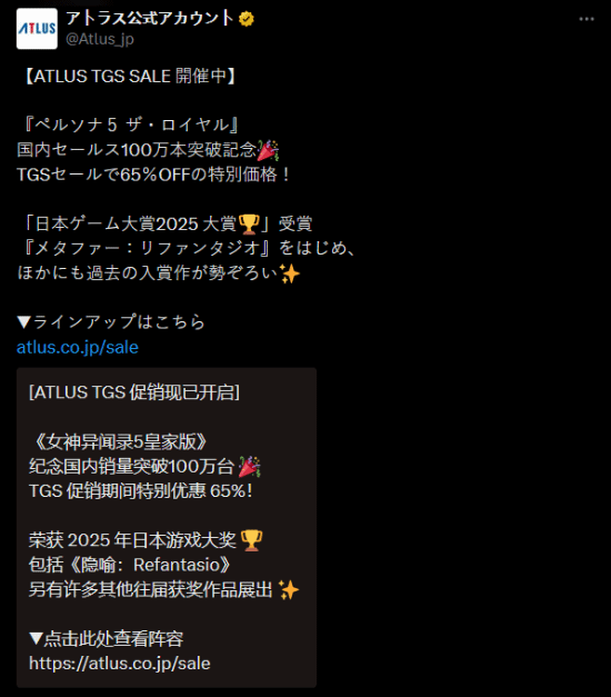 另外,本次促销活动中也包括刚刚获得日本游戏大奖“年度游戏大奖”的《暗喻幻想:ReFantazio》,除此之外还有诸多Atlus旗下佳作。