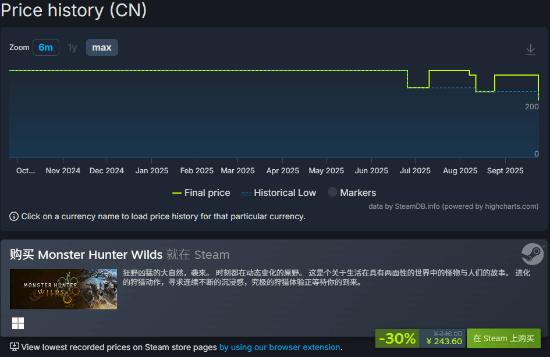 SteamDB数据显示,《怪物猎人:荒野》于9月23日迎来新史低价!目前正在7折促销中,标准版243.6元、豪华版313.6元、高级豪华版383.6元。打折仅限一周,9月30日结束。