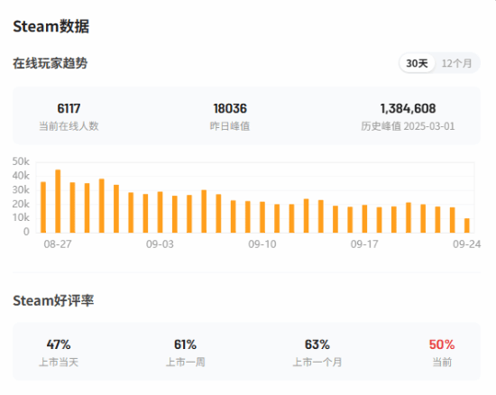 数据显示,本作的总好评率为50%。最近30天的好评率为36%,显示多半差评。简中区好评率为19%,显示差评如潮。