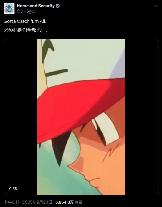 而且,美国国土安全部还配文“Gotta Catch 'Em All(必须把他们全部捉住)。”而这恰好是宝可梦的经典口号。