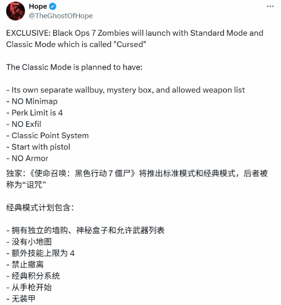 根据爆料博主Hope透露,僵尸模式将包含标准模式和经典模式,后者更名为“诅咒”(Cursed)。
