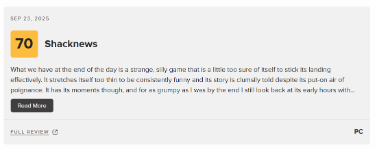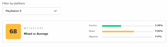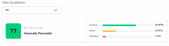 截止撰文,本作M站均分77分,PS5版收录8家媒体评测,3好评,5中评,均分68;PC版收录14家媒体评测,10好评,4中评,1差评,均分77。