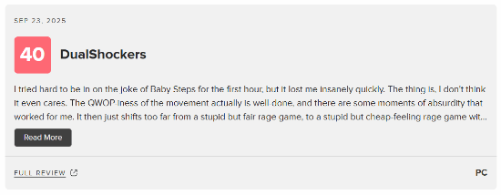 《一步一脚印》是一次令人恼火的折磨之旅,游戏中故意制作的尴尬物理效果既残酷又不可思议的愚蠢,但却异常精彩。