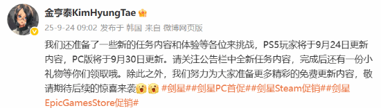 今日,《剑星》制作人金亨泰微博发文为接下来的更新预热: