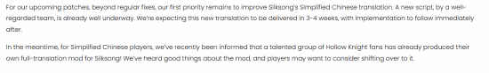 官方表示:“除了常规修复,我们后续更新的首要任务,仍是优化《空洞骑士:丝之歌》的简体中文翻译。一支优秀的团队正在全力推进全新的本地化方案,预计在未来3至4周内交付,届时将立即启动技术适配工作。”