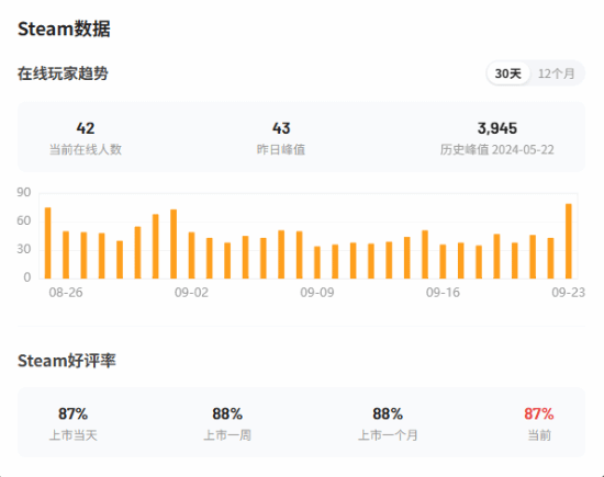 数据显示,本作在Steam的好评率为87%,平均游戏时间为11.4小时。