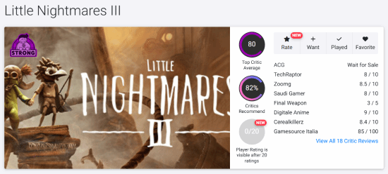 TechRaptor——8/10分:《小小梦魇3》忠实延续了前作的风格,同时新增了颇具趣味的合作玩法。游戏剧情设计巧妙且节奏紧凑,合作机制虽在部分场景中为体验增色,但在另一些场景下却起到了反效果。