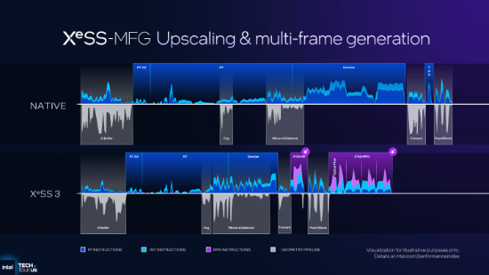 不仅如此。XeSS 3 MFG支持范围也广泛,将支持所有配备XMX硬件的锐炫GPU和产品,这意味着不仅最新的Panther Lake将支持这一功能,就连老一代的Xe1 GPU,如酷睿Ultra 200H 和锐炫A系列独显,也将获得支持。