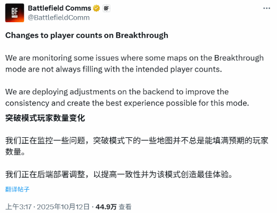 在《战地6》正式发售后的48小时内,EA开发团队已火速推出多轮修复更新,积极回应玩家反馈。首日即解决了游戏内奖励丢失、内容安装异常等问题;次日针对“突破模式”地图玩家数量未达预期的情况进行了后台调整。