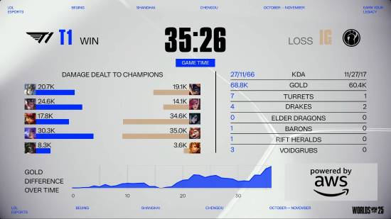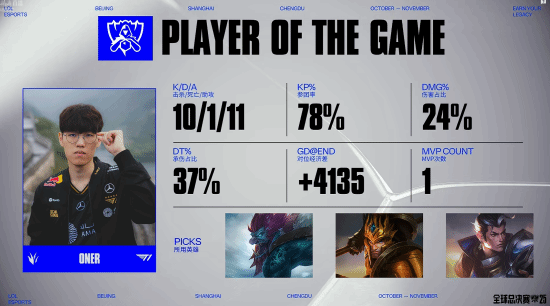 34分钟,T1拿下龙魂,Gumayusi芸阿娜和Faker安妮拿下双杀,T1顺势推平基地赢下比赛。