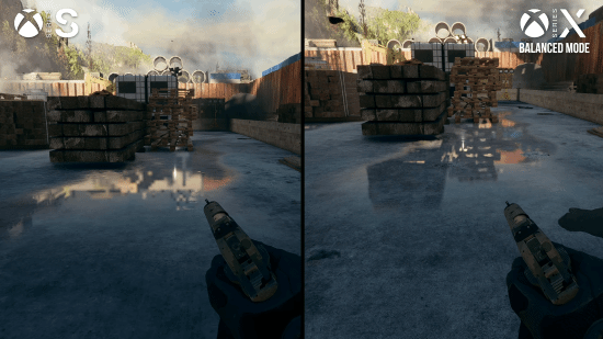 相比之下,Xbox Series S提供的是一个更受限制的版本。它只有一种画面模式,帧率上限为60fps,但为了达到这一表现,画面质量进行了大幅削减。阴影细节明显下降,屏幕空间反射被替换为基础的立方体贴图,全局光照也被简化,导致户外光线显得较为平面。材质贴图更模糊,缺乏反射光的场景在开阔区域尤为明显。分辨率通常以1080p为目标,但经常会低于这一标准。尽管存在这些妥协,游戏整体运行仍相对流畅,仅偶尔出现帧率下滑。