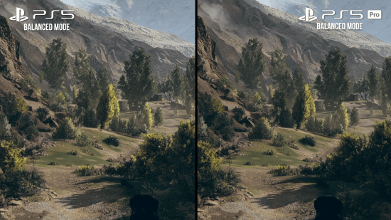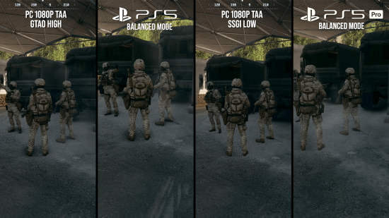 PS5 Pro则带来了更明显的升级。它采用与PS版相同的SSGI(屏幕空间全局光照)技术,而非基础版PS5所使用的GTAO(地形遮蔽)方案。此举带来了更自然的光照表现与更精准的阴影效果,同时消除了在旧主机上出现的暗边伪影。PS5 Pro的画面锐度接近原生4K,但由于使用了PSSR而非FSR,画面在植被细节上略显粗糙,并伴随轻微图像噪点。即便如此,其帧率几乎全程锁定在60fps,整体体验依然极其稳定。