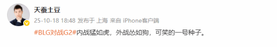 今日报道,在《英雄联盟》S15瑞士轮第四日里,G2 1:0击败BLG,这一结果让众多玩家感到愤怒。随后,《斗破苍穹》作者“天蚕土豆”在微博发文谈到了自己对于此事的看法,说道:“内战猛如虎,外战怂如狗,可笑的一号种子。 ”